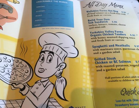 Mosaic Grille在Hyatt Regency宾馆的2楼。提供儿童餐,儿童的活动纸非常漂亮而有趣。某些大菜单上的项目,也可以按儿童的份量提供,只收取大人费用的一半。儿童牛奶1.95刀,可免费续杯。餐厅装修和餐具凝重朴拙,有大家风范。