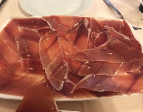 火腿博物馆在马城有好几家 数这家最大 位置就在圣米盖尔市场边上 共三层 缘于5/1节日 一层大堂 人头涌动 基本只能站着吃 二层三层可以坐下慢慢品 火腿点了Jamon家族的最贵和最便宜 再加上蘑菇 小食 果酒 挺棒