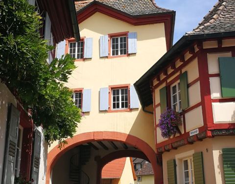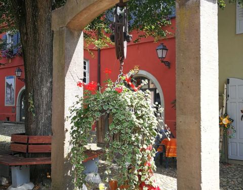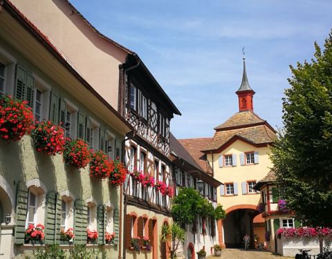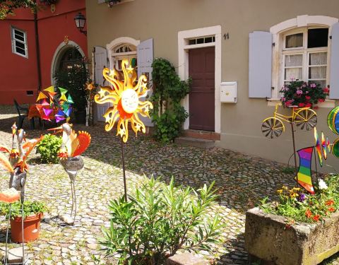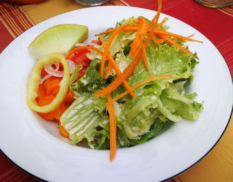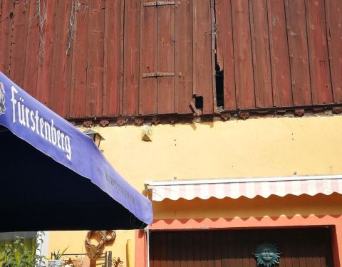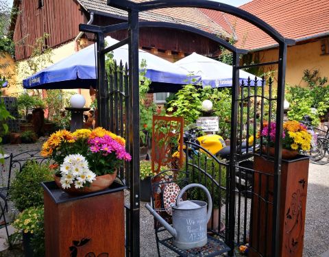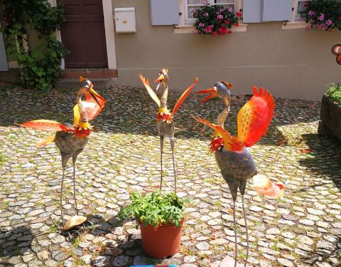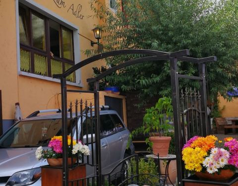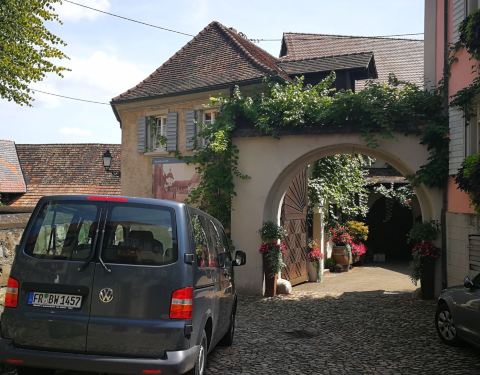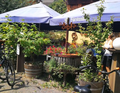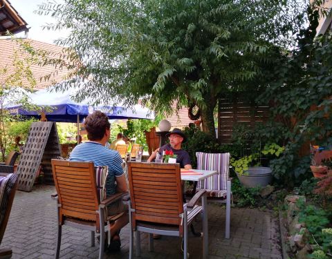 这家餐厅位置很乡村的,去过的人也少,即使在Trip Adviser上也只有寥寥几条点评,而且除了一条日文的其余都是德文。这里是德国最西南部的上莱茵地区,隔莱茵河与法国的阿尔萨斯-洛林相望,南下不远就是瑞士巴塞尔,是历来兵家必争之地。这里还是优质葡萄酒和香槟的产地,围绕着皇冠峰,一层层的梯田种植的绝大多数是葡萄。不过这儿算不得旅游景点,旅行手册上是根本查不到什么资料的,近年才开始有个别亚洲面孔出现。德国乡下的乡下,Vogtsburg小镇下面有7个更小的村散布在皇冠峰周围,Gasthaus zum Adler就坐落在Birkheim村口。中午从Lahr的德国乐器工匠工作室出来,绕过皇冠峰赶到这里,村口车子靠边一停,就急不可耐坐下点菜。室外花园的空间不算很大,乡土气息浓厚,天气晴朗,也没人愿意坐在室内,就只有老板娘在忙,上菜速度稍慢,不过这里的乡村生活就是慢悠悠的