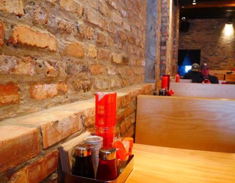 主要还是吃拉面,不过也有一些小食提供。砖墙和木条长桌的布置原始简洁