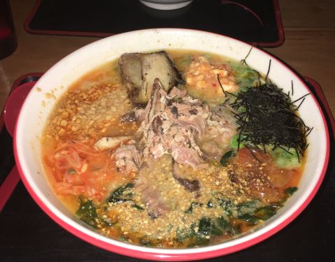 砖墙和木条长桌的布置原始简洁。主要还是吃拉面,不过也有一些小食提供。每天11点到下午2点有午时套餐,性价比不错,可选主食米饭、配菜、饮料等等,适合附近上班一族~拉面口味还算不错,汤汁浓郁鲜香,传统、辛辣、泡菜、素食选择都有,配菜也能随意搭配。