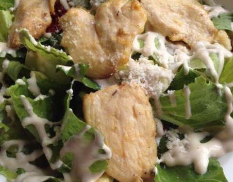 鸡肉色拉挺不错的,量也不少,关键是上面的鸡肉是烤鸡肉。而且是刷过酱料的。罗马生菜叶子非常新鲜,非常嫩。撒上一点芝士粉很好吃。