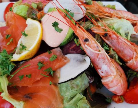 小镇一共三家餐厅都在一起,热闹程度差不多就随便进了一家。点了鱼排和海鲜饭,味道还不错,烟熏三文鱼沙拉不错,份量都很大。点了几种白葡萄酒和啤酒都很好喝,甜品也相当不错,比在格拉斯吃的冰淇淋好吃多了。