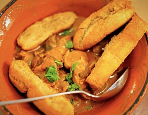 塞维利亚Duque餐厅,海鲜饭跟西班牙海鲜饭最大的区别可能就是海鲜汤泡饭,米难得这么软啊,流下了思乡的泪水,看翻译软件说是辣味鸡肉配面包,其实基本上连微微辣都算不上,旁边配的炸面包还挺好吃,感觉像油条?...