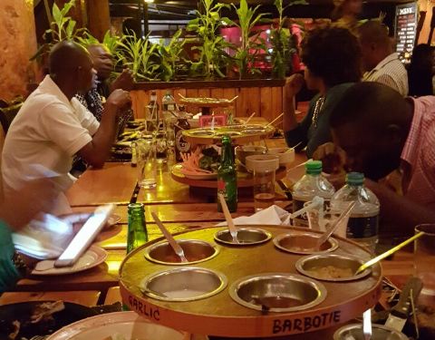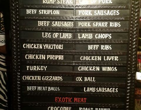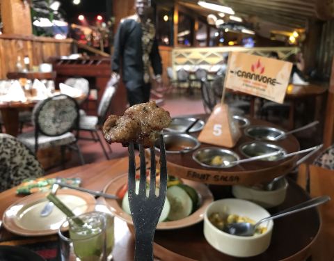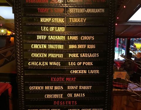 这家店是肯尼亚最出名的肉食自助餐厅,环境我个人就很喜欢,因为有很多野性的细节,喜欢动物的摆设,有鳄鱼肉,还有很多奇怪的肉类,甚至还有表演看,烤肉很热闹。