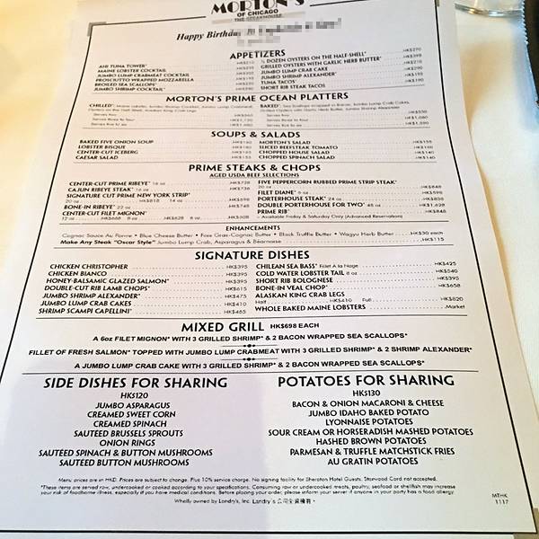 全球最知名的连锁牛扒西餐厅!Morton's对于喜爱牛扒的人肯定都不陌生,因为这是一个全球都有很多分店的一个美国著名扒房。而香港的分店就位于著名的喜来登酒店4楼,这个地理位置非常优越,靠近维多利亚港、星光大道、香港太空馆等景点,而且距离尖沙咀和尖东两个地铁站仅有5分钟的路程距离。香港喜来登酒店已经开业了40多年,已经是一间很古董的酒店,所以餐厅的装修也偏向于复古风一些,整个餐厅的灯光也是偏暗偏柔和的,餐厅的靠窗位置可以观赏到维港景色,所以如果喜欢看夜景的客人,预约座位的时候可以要求窗边座位。餐厅的较里面,还有一个酒吧台,不吃牛扒的客人,也可以在黄昏过来品尝一下美酒,观赏一下海景。餐牌都是全英的,但是里面有会中文的服务员,可以叫服务员做介绍,而且服务员还会拿出一对生牛肉,逐一给你介绍牛扒的种类和品质,非常专业。餐牌主要分了头盘、汤类、主食和配菜等等,主菜的价格都是600元起的,但是一份主菜还是挺大的,可以分享来吃,人均大约800-1000港币左右。另外还有一个饮料菜单,由于我和朋友都不喝酒,所以我点了一瓶矿泉水,他就点了一瓶气泡水,这两瓶水都不便宜,一瓶就80元了。点好餐以后,餐厅就会上餐包,这是我在扒房吃过最大的餐包,比我的脸还要大,如果吃完这个包,真的不用吃其它东西了,我和我朋友吃了一半都没有就停了,个人觉得餐包做这个大份实在太浪费了,希望下次能有小一点的。前菜我们点了一个蒜蓉烤生蚝,生蚝很新鲜,而且这里的蒜蓉也不会像其它餐厅那样,把生蚝的味道和口感抢去了,两者味道和平衡。汤我们点了一个龙虾汤,餐厅很贴心的帮我们把一份龙虾汤分成两小份了,虽然说是分了小份的,但一个人的份量还是很充足的,龙虾汤有点微苦,但很浓郁,很鲜味。主菜我们点了一个混合烤类的,里面有牛扒、带子和大虾,这样一道菜就能尝到三款不同食物了。牛扒肉质很好,五成熟还能看到粉红色的肉质。带子很大一颗,被培根包裹着,一口咬入口中非常满足。大虾也还算新鲜,但没有太大亮点。最后还点了一个芝士薯条做配菜,以为就小小一盘,没想到超级大一桶,完全吃不完,但味道确实很不错,比麦当劳的好吃多了。这家餐厅很适合庆祝特别节日,餐厅会再菜单纸上写上你的名字,就像你的专属菜单一样,然后还会送一个甜品作为小惊喜,最后还会拍一张照片,放在卡片里面送给客人。所以如果要在香港庆祝特别节日,一定推荐Morton's。
