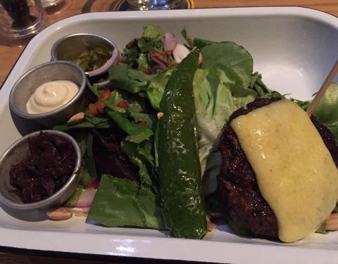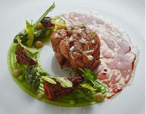 烤烟熏法国乳鸽伴彩色瑞士白菜及粗皮青柠