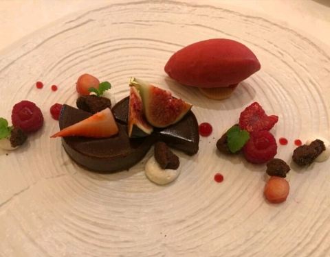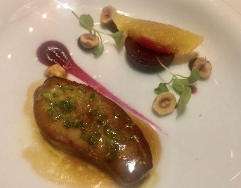 香煎鸭肝配蜜煮樱桃及鲜杏仁