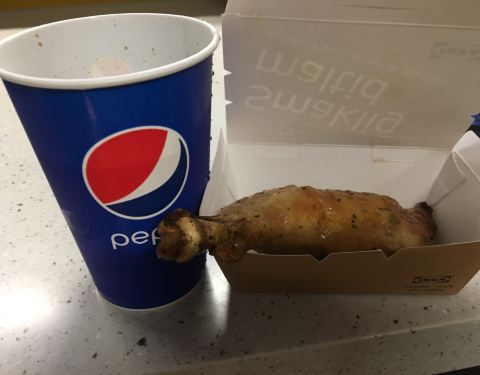 听说大陆的宜家都快成了老年人的相亲角,一坐就一下午,一分钱不花。在香港的宜家,可没这么好的条件,这里宜家的餐厅,全都只能站着,能有个小桌放放饮料就不错了。卖的东西很简单,鸡腿、瑞典丸子、百事可乐,不过价格也的确便宜,比在外面吃一餐省钱多了。