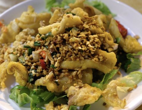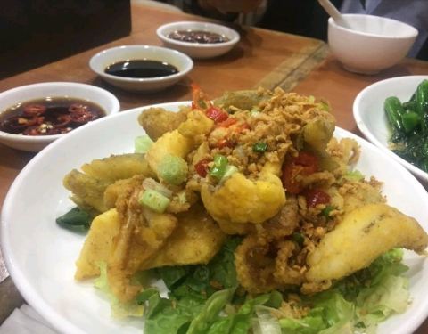 - 超级好吃的,炸粉很薄,炸得酥脆,鱿鱼爽口。 我们还点了椒盐鲜鱿,这个非常推荐