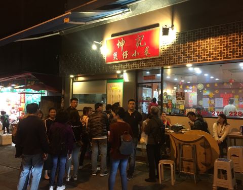 路过了坤记很多次,但是每次都被店外排队的人给吓退了。心里面也暗暗记下了这家店,一定要来吃一次。于是这一天在18点刚刚开始营业的时候就来了,顺利的进到里面坐下来。点了一份腊味排骨饭,90蚊。店里的人不多,但是煲仔饭的上桌速度还是很慢,因为每一份煲仔饭都是现点现做,等于说你要坐在那里等待着大米慢慢的煨成米饭端上桌。炉火上一共可以放十只煲仔砂锅,就看师傅不停的忙着。一锅煲仔饭端上桌看着是好大一份,但其实不太吃锅边上的锅巴的话,一个人还是很容易吃完的。淋上那一碗酱油,豉香加上锅巴香,还有腊味和排骨的肉香,味道非常丰富的一锅饭。
