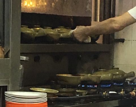 - 心里面也暗暗记下了这家店,一定要来吃一次。炉火上一共可以放十只煲仔砂锅,就看师傅不停的忙着