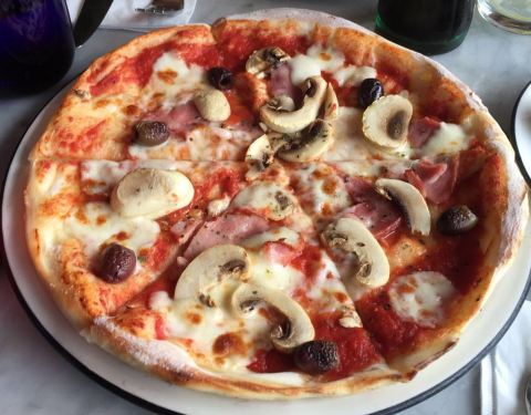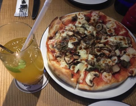两个人每次吃披萨都有一些不太好点餐,一个披萨两个人分又不够吃,但若是点两个又太多了一点。还好Pizza Express除了披萨之外还有一些小食,饮料也不错。这家店的披萨挺好吃的,点完餐之后现烤,所以大概要等十几分钟才能端上来,热热乎乎的,芝士刚刚融化有拉丝的效果,搭配饼皮嚼得很香。