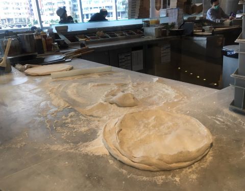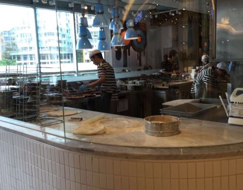 在香港看到过好几家Pizza Express,也吃过好几次,很习惯它家的披萨味道,环境也挺好。在APM闲逛时,又看到Pizza Express,不过这家店却有点点与众不同,它的厨房是半开放式的,厨台上做饼的过程是全都看得见的。如何揉面、发面,那些面粉是如何在师傅的手里变成一张张大圆饼,然后再送进烤箱烤至金黄酥脆。对于不懂制作面点的我,这简直就是一个神奇的过程