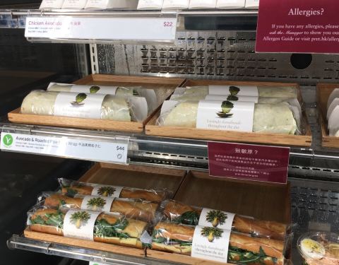 金钟地铁站里面有没有这一家我不是太清楚,但是我是在金钟地铁站楼上的天桥上买的这一家的牛角包,在力宝中心与金钟廊天桥的衔接处。这一家主卖的是三明治,同时也有很多的新鲜沙拉,像是苏格兰三文鱼藜麦沙拉、牛油果蓝泳蟹肉沙拉,听起来都是一些高档的食材,然后很健康的组合,主要的目标消费人群就是忙碌的白领。