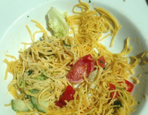 Ich hatte Tagliatelle mit Tomaten&Rucola und Parmesan bestellt. Schaut Ihr was ich da bekommen habe!!! Damit a bissl Geschmack reinkommt, habe ich einfach das Salatschüsselchen in den Teller gekippt!