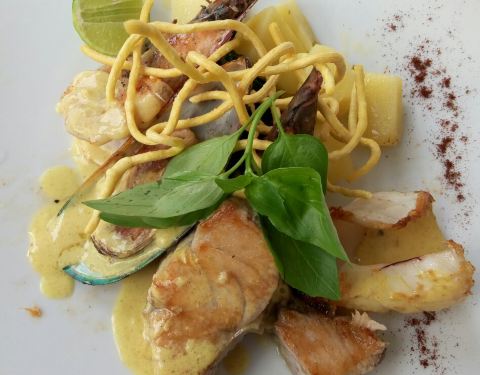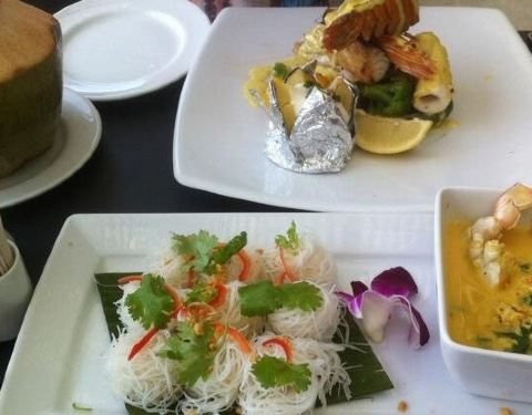 有点欧洲露天咖啡店的感觉,白色的装修,感觉很清凉。菜的味道都很好,青口洒了面包糠烤的很香,鲈鱼做得非常赞,有泰国风情,却又很符合国人口味,咖喱鱿鱼也很好吃。一定要点椰子冰沙,味道超正,纯纯的椰香又不会太甜。