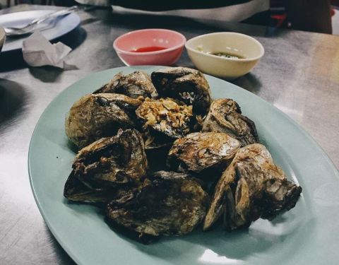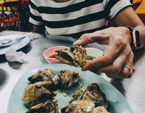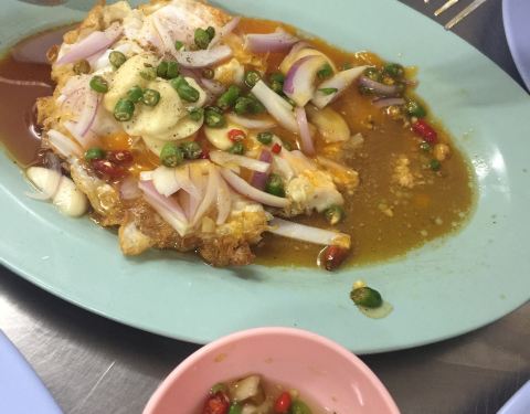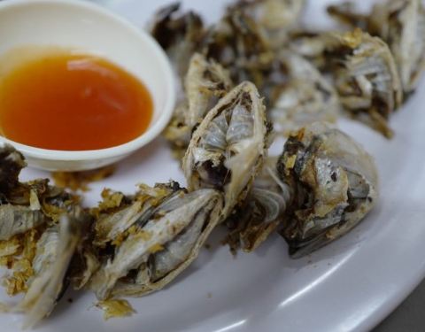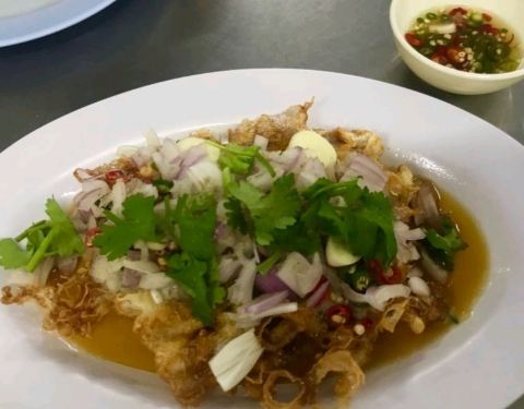 开胃菜,名字叫kaem pla too tod,非常不起眼,就是油炸印度洋鲭鱼头,我点这道菜因为Mark Wien说只有在Soei才能找到这道菜。这道菜很简单,就是鱼头的外壳和蒜泥一起高温油炸,配上辣椒酱。