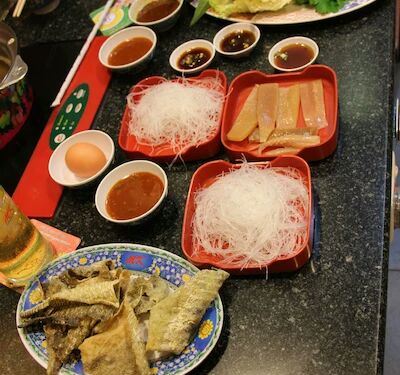 当地比较高大尚的火锅,在2楼,环境很棒,锅底是清汤,需要自己加酱料进去,推荐牛五花,猪肉鸭肉拼盘,价格小贵,味道还不错。 - 锅是白水煮的,调料是沙茶酱和酱油这些,菜品新鲜,牛肉很好吃,不要点猪肉,会有很多泡沫