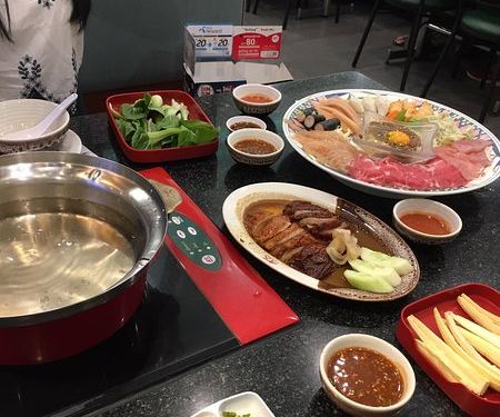 第一次在泰国吃火锅,和以前吃的火锅不一样。这种火锅锅底相当的清淡啊。价格略有点贵。选了两人套餐,有赠送一碟烤鸭。感觉烤鸭比火锅里的内容还好吃。当然虾丸还是很不错的,个头大。套餐内容吃完我们还觉得饿...第一次在泰国吃火锅,和以前吃的火锅不一样。这种火锅锅底相当的清淡啊。价格略有点贵。选了两人套餐,有赠送一碟烤鸭。感觉烤鸭比火锅里的内容还好吃。当然虾丸还是很不错的,个头大。套餐内容吃完我们还觉得饿就追加单点了豆腐粉丝等等。总之性价比不是太高。