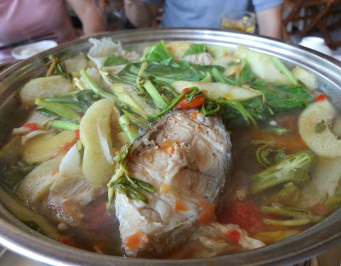 今天最大的特色应该是那个火锅了,里面是切得很大块的鱼块,还有一些杂菜,酸酸甜甜的,挺好吃