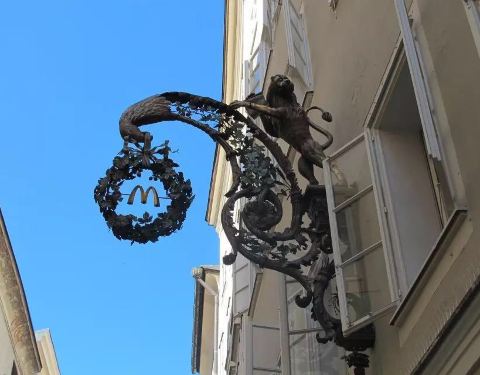 麦当劳完完全全就是典型的现代快餐,而在萨尔茨堡,用传统的铁艺招牌,让每个人都很熟悉的M字显得如...