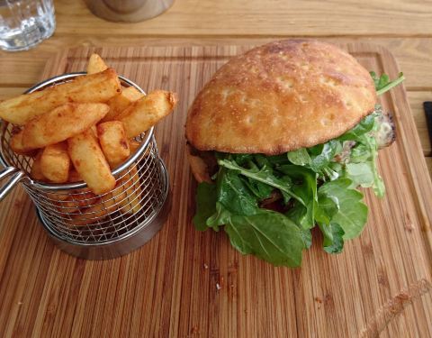 Despite being served on a breadboard, the wagu beef burger was amazing. Included beetroot and delicious caramelised onions. Great coffee too.