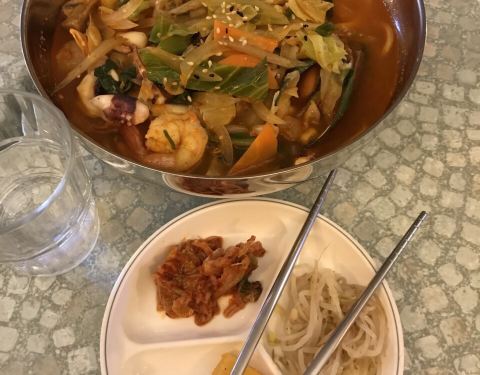今天爬山走累了想吃韩国菜!酸酸的辣辣很解乏!于是我们就在网上找到了这家!这里环境不错!人不多不少刚刚好,服务员小哥热情,我们点了一个海鲜面汤,两个石锅伴饭⋯⋯味道很赞的哦……