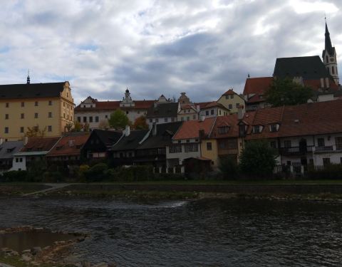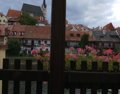 捷克,克鲁姆洛夫(五)。 饭店。 在克鲁姆洛夫小镇吃饭,在桥边上,照片是在饭店拍的,对面艺人弹吉他。 环境优美,感觉舒适,不能错过当地黑啤及美食。