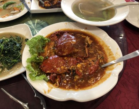 就在TF超市的旁边,卖海鲜的中餐,可以拯救一下中国胃,点了地瓜叶、炒藕、蔬菜汤、虾球和辣螃蟹。辣螃蟹还不错,虾球稍老但味道也还不错,总体稍贵但对味道很满意。另外,发的红色湿巾是要收费的。虽然也是吃团餐的地方。可以要求会中文的人服务。
