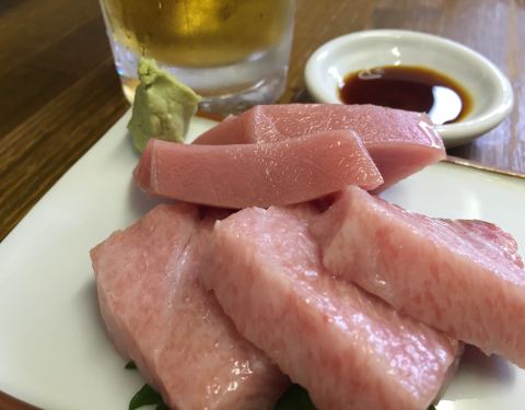 本マグロ刺身400円 ほぼ中トロなんで幸せな気分を味わえました。切るの面倒くさいん?と思うほどぶつ切りで大きい刺身がたまりません‼︎