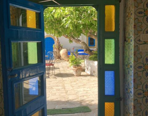 这家餐厅是一家非常突尼斯当地特色的餐厅,它坐落在一个非常漂亮的小院子内,整个院子的窗户门都是五...
