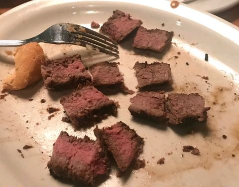 木质结构的门面,墙上装饰的鹿脑袋,还有充满节奏的乡村音乐,都营造出一股属于美国西部的“老土”的味道,正是这种“老土”,让我在走进餐厅的一刻,就感到了浓浓的西部牛仔式的热情。要知道在19世纪后期,德克...木质结构的门面,墙上装饰的鹿脑袋,还有充满节奏的乡村音乐,都营造出一股属于美国西部的“老土”的味道,正是这种“老土”,让我在走进餐厅的一刻,就感到了浓浓的西部牛仔式的热情。要知道在19世纪后期,德克萨斯是美国养牛最多的州,也是最具有牛仔文化代表性的一个州. 前台工作人员会询问客人人数,然后指派一个服务生领着客人入座。我们是晚上将近10点才抵达餐厅,但生意依然火爆,而在大部分时刻,客人往往还要等上一阵子才有位置。客人可以选择室内或室外的座位,室内便是在这样一个弥漫西部气息的餐厅就餐,而室外,客人或许可以有幸看到音乐喷泉起舞。服务生友好地领着我们穿过餐厅去往户外的位置,餐厅的厨房为敞开式,客人能直接观看厨师如何烹饪牛排,而正对大门的,便是一块块新鲜的生牛排,光看着就能勾起肉食爱好者的无限遐想,餐厅里聚集着一摞摞的肉食爱好者,大多为男性.