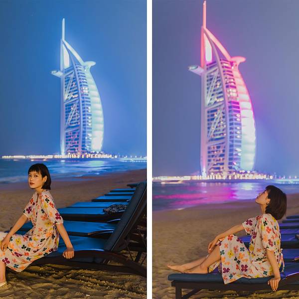 不管什么时候来,景色都非常好。下午可以一边喝下午茶,一边看帆船酒店;傍晚可以舒适地坐在躺椅上看日落;晚上更是浪漫无比,可以看到帆船酒店绚丽的灯光秀。
