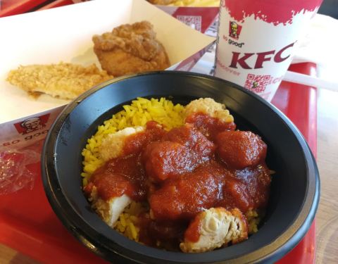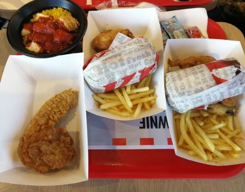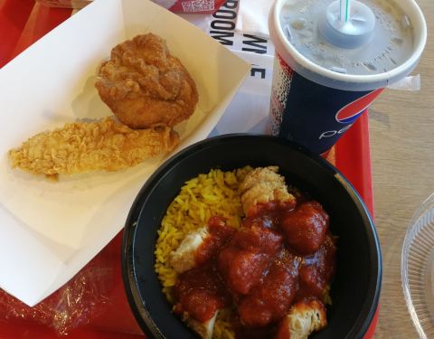 最后一天的酒店住在世贸中心旁边,这条街上有很多24小时餐饮。最简单的就是肯德基了。价格也是在迪拜吃到最便宜的。18迪拉姆的套餐量很丰富,里面有鸡块饭和二份鸡肉。味道还算可以吧。