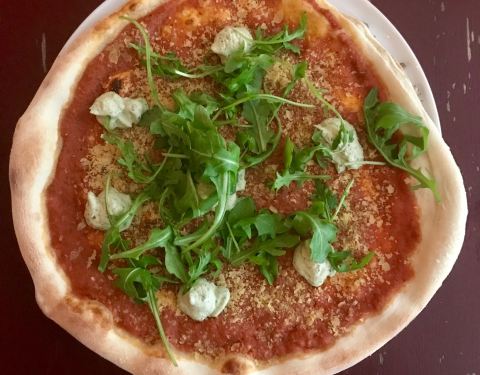 Marinara is for vegetarians. Tasty without cheese. Pizzas can be ordered gluten free. Best for late pizza and wine. Try hell yes! Red wine.