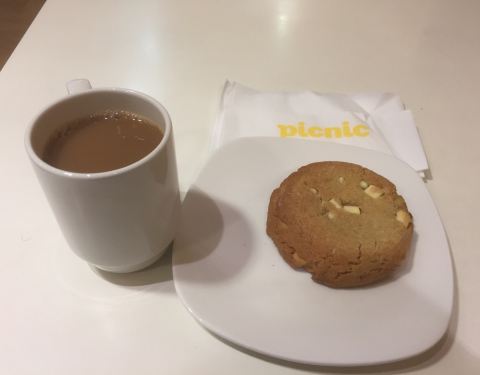 店釆用自助形式,客人付了钱自己去机器拿饮料,吃的都是收银负责,吃完就自动自觉把餐具放到指定的地方。他们的咖啡不够浓,味道跟开水差不多,但白巧克力曲奇则不错,不太甜而且还有巧克力的香味。