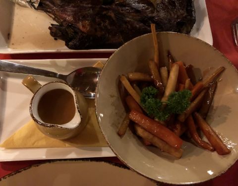 这个区域评价最好的餐厅。 地理位置有点偏,最好自驾或预定车前往,如果要在餐厅门口打的也不是件容易的事。 这个是家庭模式的餐厅,所以工作人员都是老公、老婆、爸爸、儿子的关系,都很友善和健谈。 餐厅内有个大大的壁炉,客人们都爱在壁炉前坐下,感受温暖。 这个壁炉还提供烤食物的功能,不过烤出来的腿有一点点偏干,味道还过得去。