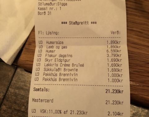 冰岛赫本的这家海鲜餐厅是当地最好的餐厅了,这家最著名的菜肴就是龙虾,龙虾都是冰岛深海捕获的野生龙虾,味道非常的好,肉质微甜弹性十足,非常的好吃,就是价格较贵,两人吃了1000多元。