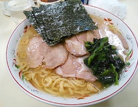チャーシュー1枚、海苔3枚、ほうれん草のオーソドックスな家系ラーメン。キャベツラーメンはその上にキャベツが乗ります。