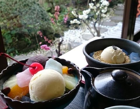 約100年前の個人宅を利用して作られた甘味処です。囲炉裏がある席もあります。畳の部屋では、季節の草花(今何が咲いているのかホームページで紹介されています)が咲くお庭と、時折通過する江ノ電を眺めながら舌鼓を打ちましょう