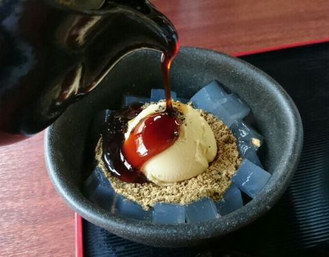 クリームあんみつ(800円・税込)。一緒にほうじ茶も付いてきます。少し小ぶりですが、歩き疲れた身体にはちょうど良い上品な甘さです。黒蜜は好きなだけかけることができます。 古民家の雰囲気も味わいながら、静かで贅沢な時間を。
