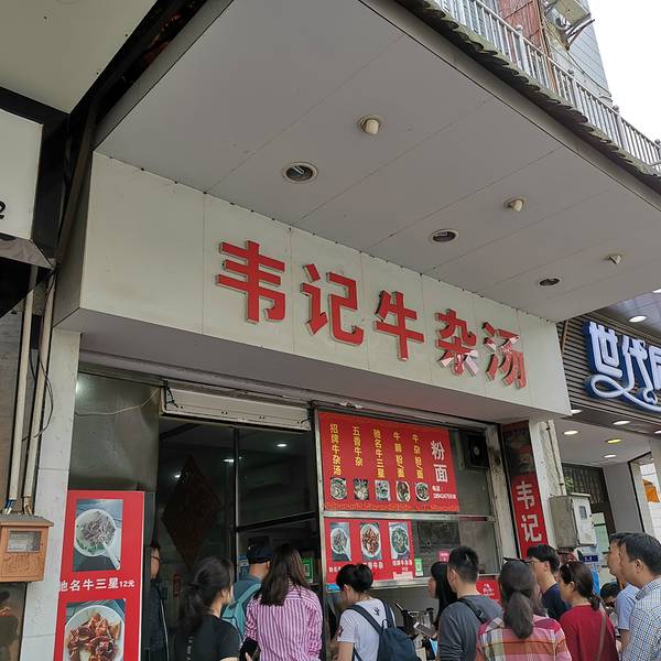 在热闹的步行街上,细妹排队的人超多,果断放弃来韦记,韦记也是要排队半小时的节奏。五香牛杂,牛杂软烂可口。很香也没有怪味。里面的萝卜,香甜可口。还可以加点辣酱调味。店面很小,除了外卖还有几张桌子可以...在热闹的步行街上,细妹排队的人超多,果断放弃来韦记,韦记也是要排队半小时的节奏。五香牛杂,牛杂软烂可口。很香也没有怪味。里面的萝卜,香甜可口。还可以加点辣酱调味。店面很小,除了外卖还有几张桌子可以做着吃。