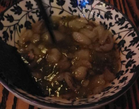 日式居酒屋格局,里面太暗,食物水平整体差,个别不错,冷豆腐没有豆香,烤牛舌有部分太韧咬不动,鸡软骨口味不错但是焦的部分太多,鸡胗,可以,猪颈肉没有什么味道,也硬了点,烤大蒜好,没有过干,蒜也爽口,鸡翅太干,芥末章鱼一般。