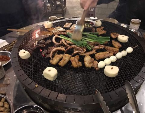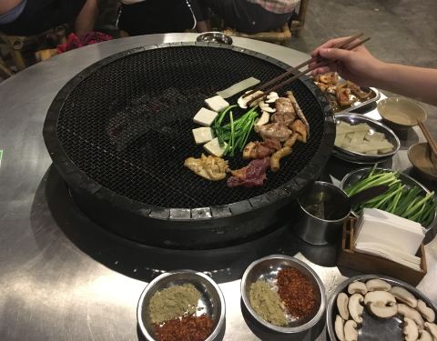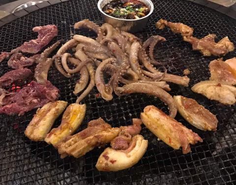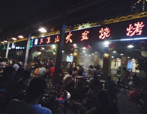 烧烤吃过很多,火盆烧烤没有吃过,于是决定尝尝鲜,这家的位置很奇特,你跟着导航滴滴过来你是找不到的,因为它跟你根本不在一个平行线上,所以大约到了附近的时候你就应该果断下车,火盆烧烤的位置是在河边,你就下车找个口往下走就能看到一大片的烧烤啊排挡的店,这家的生意特别的好,我们去的时候都没有炉子,外面的风还特别大,等了好一会儿我们差点放弃的时候才有的位置,炉子特别特别的大,其实我们也就两个人,看到这么大的一个盆,我们都是沾着边角烤的,真的太大了,味道其实真的也一般,人特别多,大家应该图的就是这样的一个气氛。