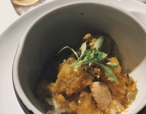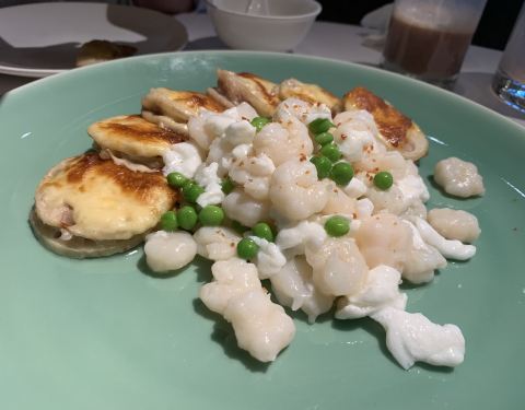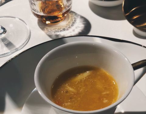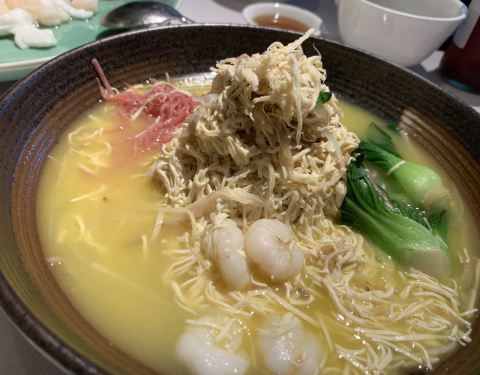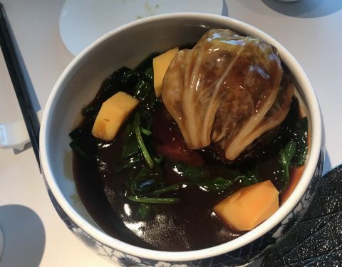 中午,没有预约,还好不需要排队,有座位。 虽然在大堂,基本满席,但是相对安静,大家都专注在美食中。 他家口味很符合江浙沪一带的朋友,摆盘也很好看,服务也很不错。 我们4个人点了午市的4人经典套餐,根本吃不完。 推荐: #温泉蛋白芦笋,口味清蛋; #芙蓉河虾仁拼芝士藕饼,芝士藕饼香,虾仁鲜嫩; #佛门素鸭,有点酱甜口味; #豆汁鱼头煲,鱼头炖的不错,汤也很好喝,不过略有点油,加点胡椒粉喝。 #鲳鱼焖饭,很香,可惜实在吃不下啦,强吃了2-3口。
