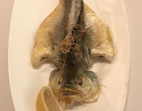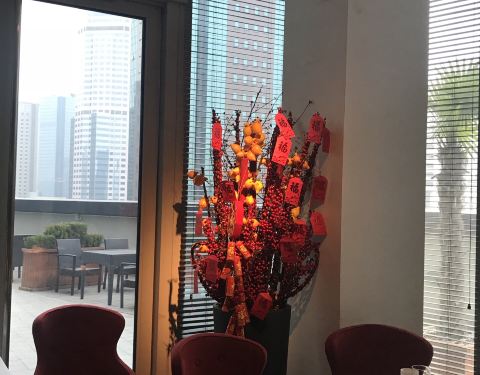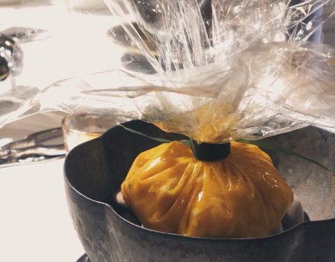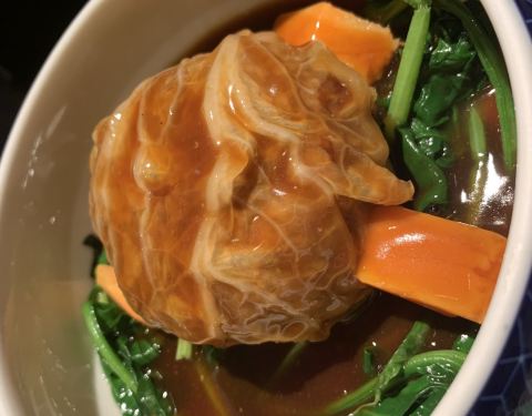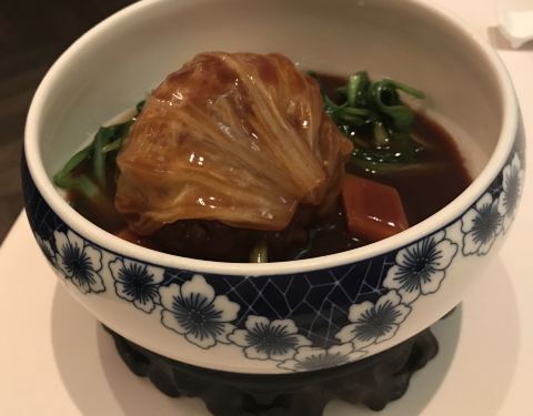 店堂明亮,设包房和露天座位,大堂内的圆桌有隔断,互不打扰。橙香火焰鸭是特色菜之一,个头不大,塞满糯米有点像八宝鸭,上桌前淋朗姆酒点燃,鸭皮带着橙香,微甜。干烧多宝鱼去骨,调味辣度适中。松茸白菜如意卷的上汤很鲜。服务及时、态度很好。