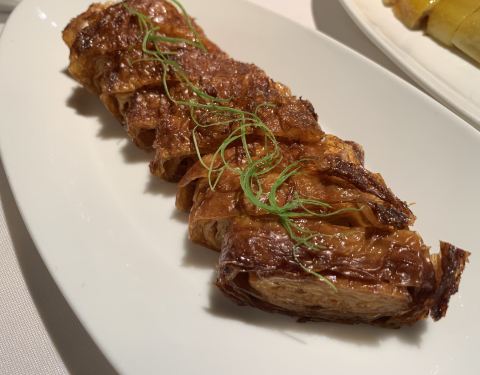 食庐,坐落在虹桥南丰城北区的淮扬菜馆,交通便利,停车方便,环境优美,服务规范周到。说说他家的菜:用材新鲜考究,菜式清爽,菜味浓郁,火候掌握精准,摆盘漂亮精致,是我喜欢的餐馆,去了几次,仍不厌烦。重点推荐淮扬软兜,其实就是用做得薄薄的春卷皮包上酱香浓郁的酱爆鳝背,所以称之为“软兜”,鳝背新鲜,切成宽条,足见这黄鳝有多么新鲜肥美,咸淡软硬程度又都恰到好处,咀嚼在口中,有着惬意的满足感。招牌烟熏黄鱼是第一次点,没想到不是那种咸咸的,充满烟火气的干瘪模样,而是肉质细腻,口感微微咸的那种,挤上几滴柠檬汁,鱼肉略略带一些酸意,就更好吃了!另外一个亮点是饮料山楂气泡水,酸甜可口,汁水浓稠,夏天喝冰饮,两口咽下,马上头脑清醒。店家正在搞活动,买一送一,可不是因为不好喝才买一送一的,是新品搞推介呢,趁此机会多点几瓶喝。去时正好端午节,店家赠送小粽子两枚,非常具有人情味。