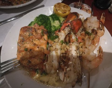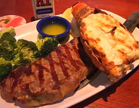 主推龙虾牛排,龙虾很新鲜,肉质弹性很足,服务生也很热情,时不时来问问我们满不满意,还给我们照合影,还点了一份龙虾意面,味道一般,熔岩蛋糕,没有熔岩,太甜,两杯饮料,一共加小费给了120刀,点餐前一定要...主推龙虾牛排,龙虾很新鲜,肉质弹性很足,服务生也很热情,时不时来问问我们满不满意,还给我们照合影,还点了一份龙虾意面,味道一般,熔岩蛋糕,没有熔岩,太甜,两杯饮料,一共加小费给了120刀,点餐前一定要嘱咐少盐,要不然他们都太重口味了,实在太咸了