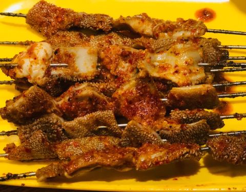 正坐在风铃酒馆里咂么酒呢,聊起收藏的店,一翻把他家翻出来了,一合计,都想撸一把,那还说啥,会钞走人! 跟风铃离得挺近,一路走一路聊,沿途看着张记烤羊腿和张妈妈川菜一家一家的从眼前飘过,心里这个馋啊~ 分司厅胡同往西拐,把口就是,门头也没了,墙上用小霓虹灯圈了个标识,黄闪闪的通知你,我营业。 [环境]店不大,桌满着,人声鼎沸的热乎劲一下子就像回到了七八月份的暑假,烤串师傅躲在大玻璃后面耍着串串,几十串在手上如农民筛糠、又如柜员点钞--动作各种娴熟,娴熟到炫技的痕迹特别明显[偷笑] 「通渭路洋芋片」排行榜第一位。吃之前先科普了一下啥叫洋芋,其实就是土豆。马铃薯这玩意儿吧,不惹味不好吃,他家这个底料据83分析是用的长条干辣椒剁成粉,嗯,吃起来的呛香味儿确实像,够劲儿,好吃! 「肉串」串一薅起来,一看是铁签子,不用吃就知道差不了。味道确实可以,瘦肉不柴肥肉不腻。 「肉筋」肥瘦相间非常好。比肉串的饱满度差点儿。 「酸辣小肚」火候正合适,抹的酱料也好,肚儿身上的尖刺带来的摩擦感很强。 「杏皮水」略甜,有股淡淡的杏香味儿,不好不坏,好歹尝过了。 「宏宝莱荔枝汽水」荔枝味儿不重,有点儿太甜了。 「烤菜花」第一次见有烤这个的,还行吧,口感太干。 「烤豇豆」不如干煸的好吃。 「平鱼」这玩意儿是真的香,吃一条不够又添了一条,鱼刺都已经不拉嗓子,配料也独到,好吃! 「烤平菇」至少没有蚕蛹味儿[捂脸] [服务]看店的是几位西北的汉子,待人很客气动作也麻利,挺好。
